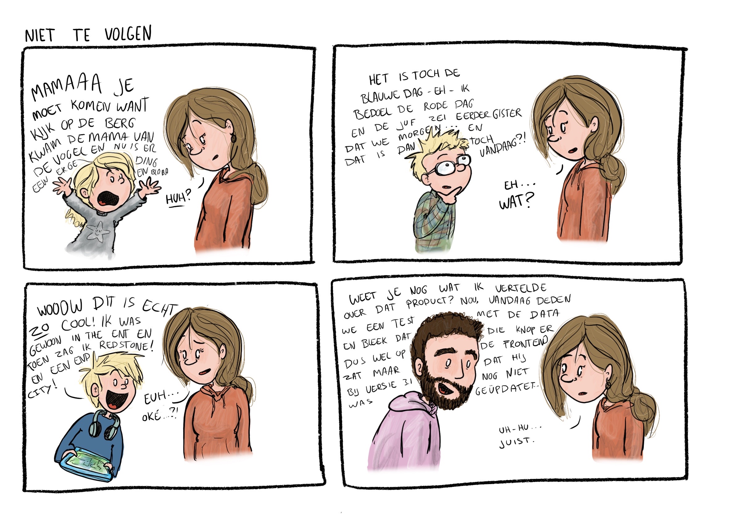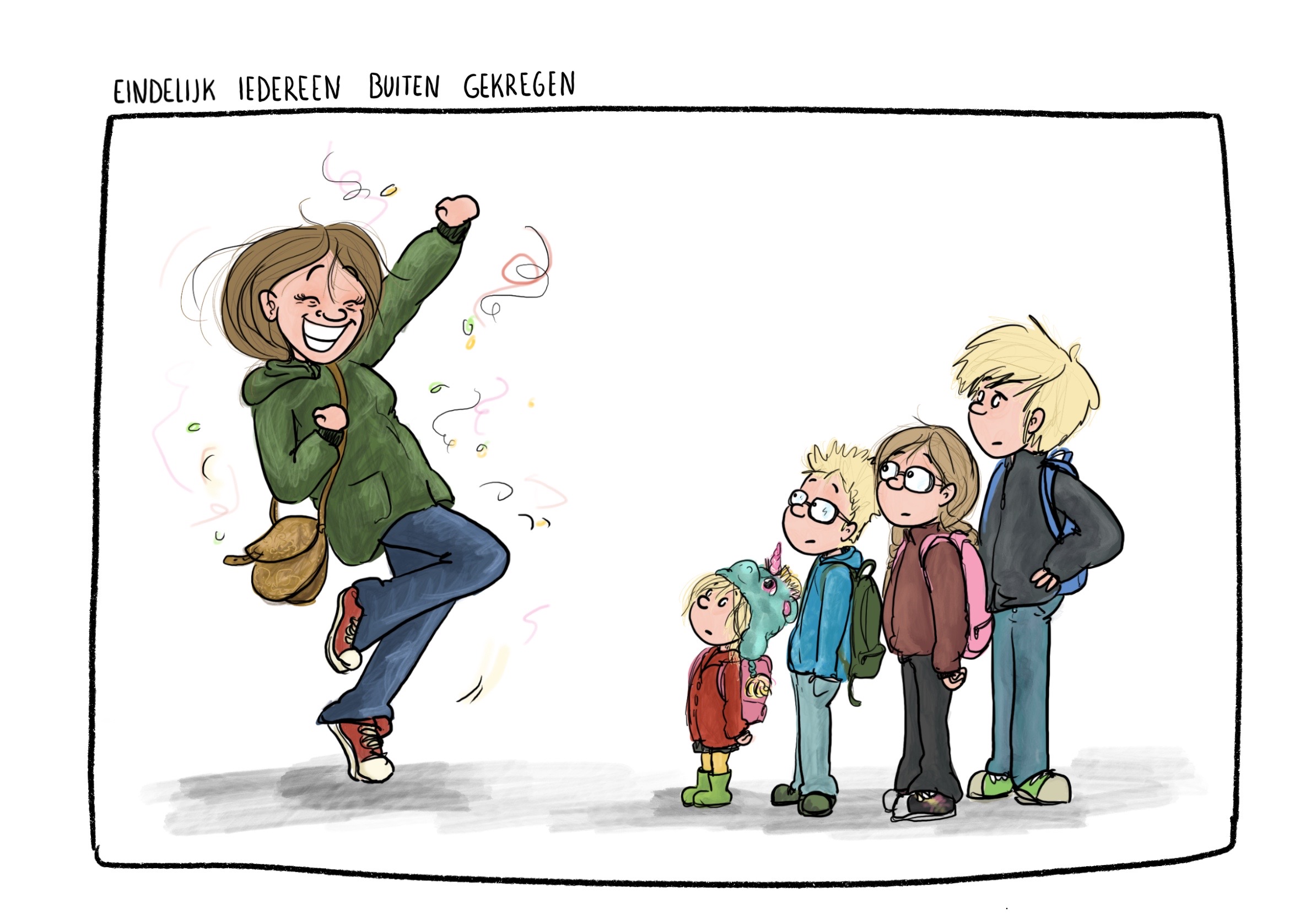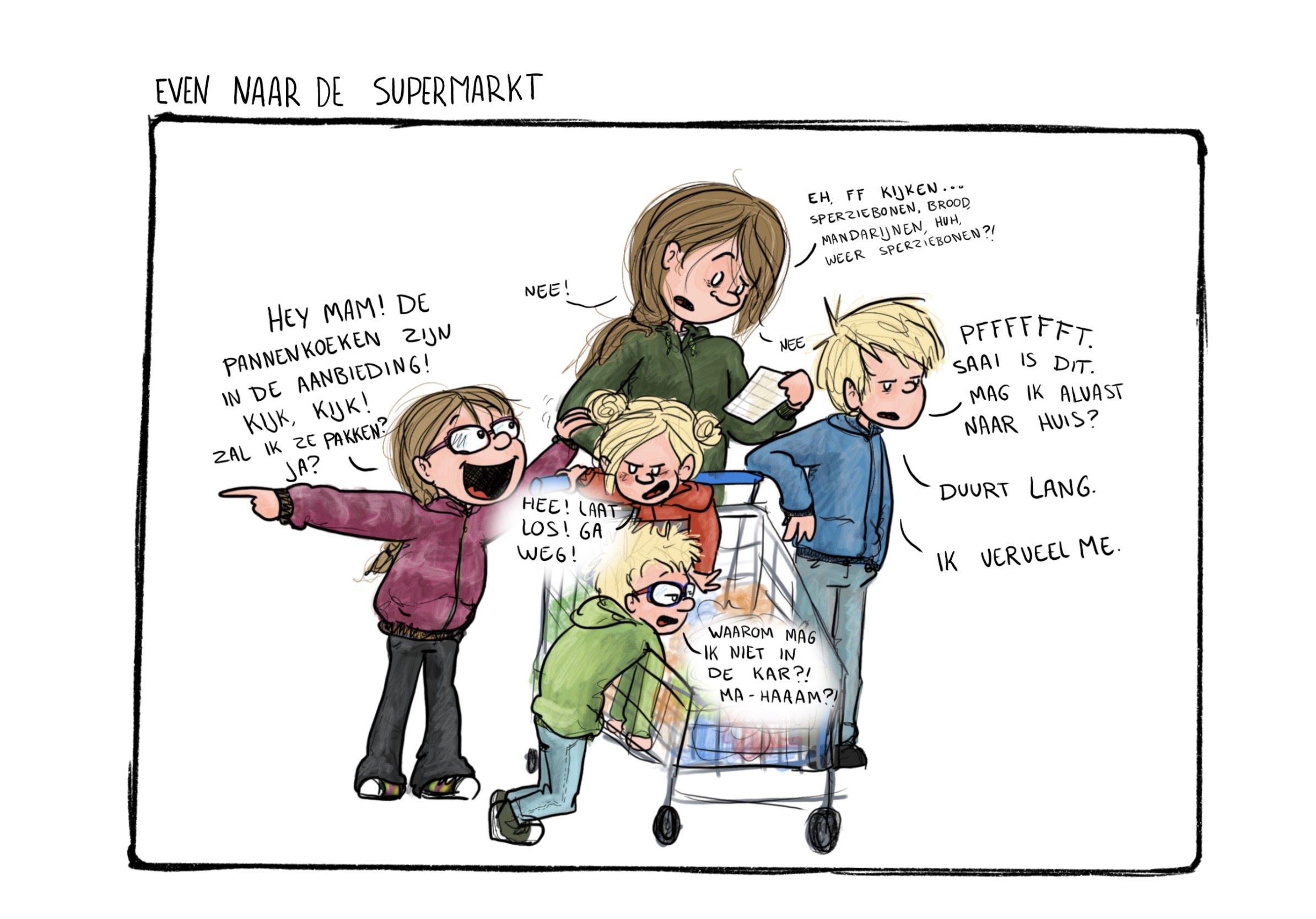Brullende baby’s, de honderd jaar die het duurt om überhaupt het huis uit te komen met kinderen, eindeloze manieren waarop je van het eten een bende kunt maken… het ouderschap viel me niet mee! Dat had ik van te voren, met mijn sociale opleiding en interesse in pedagogiek, even niet helemaal goed ingeschat. Ik begon gauw te vermoeden dat meer ouders deze ervaring hadden, maar dat iemand er als eerste over moest beginnen. Om mijn eigen mama-zijn te verwerken en om het gesprek tussen ouders open te breken, ben ik cartoons gaat tekenen over het dagelijkse leven met kinderen.